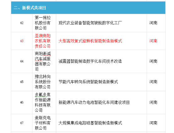 近日,亞澳農(nóng)機(jī)被國家工信部評為2017年智能制造綜合標(biāo)準(zhǔn)化與新模式應(yīng)用示范企業(yè)。據(jù)了解,這次全國智能制造綜合標(biāo)準(zhǔn)化專項(xiàng)項(xiàng)目批準(zhǔn)企業(yè)43 家,河南省內(nèi)2家,為機(jī)械工業(yè)第六設(shè)計(jì)研究院,洛陽軸研科技股份有限公司國有大型企業(yè);新模式應(yīng)用立項(xiàng)51家,河南省僅批準(zhǔn)6家,亞澳智能化制造新模式成為業(yè)界首家,并獲得國家專項(xiàng)資金補(bǔ)貼。