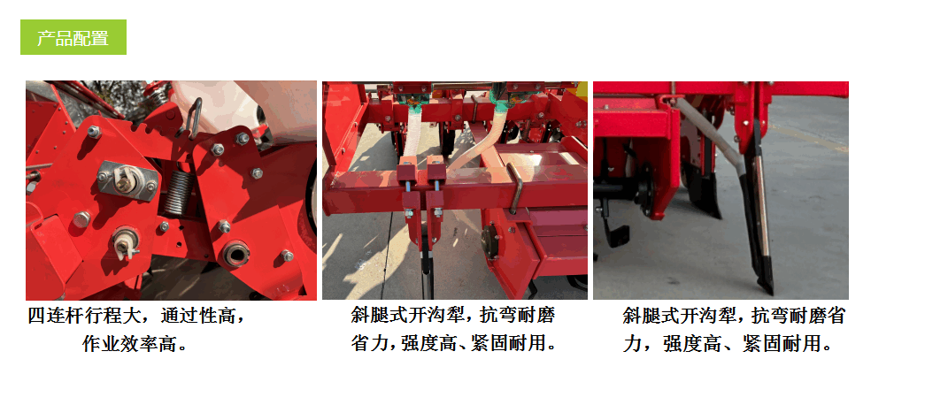 6、地輪采用單臂設(shè)計,有效避免纏繞、擁堵,各行傳動軸連成一體,統(tǒng)一驅(qū)動,傳動動力大,即使其中一側(cè)地輪偶然打滑也不影響正常播種:播種單體采用仿形設(shè)計,可隨地面上下浮動、可實現(xiàn)播深一致。