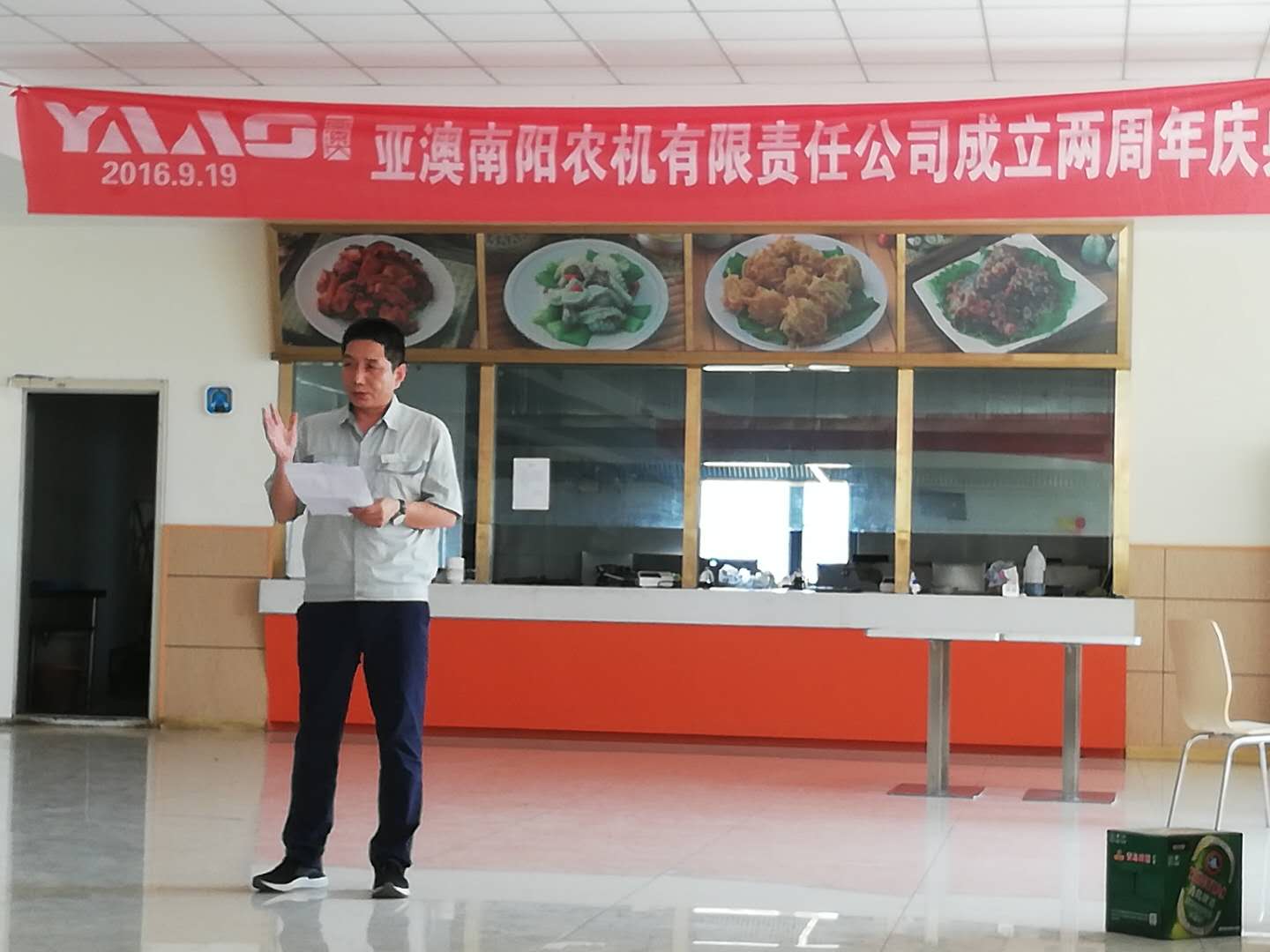 中秋佳節(jié)至,周年慶歡喜。2018年9月23日,亞澳南陽農(nóng)機有限責(zé)任公司開業(yè)兩周年慶典暨歡度中秋佳節(jié)活動在公司餐廳隆重舉行,因當(dāng)天有生產(chǎn)任務(wù),在不耽誤生產(chǎn)及各部門班組的全力配合下,慶典活動在中午12:00順利開始。