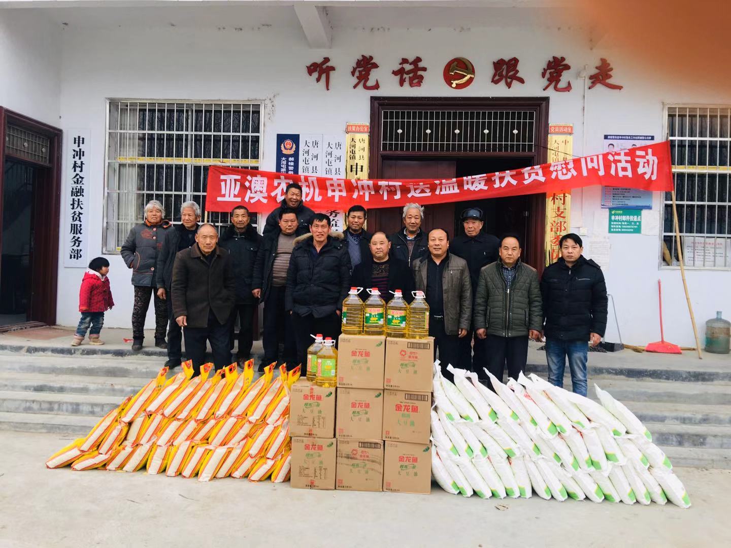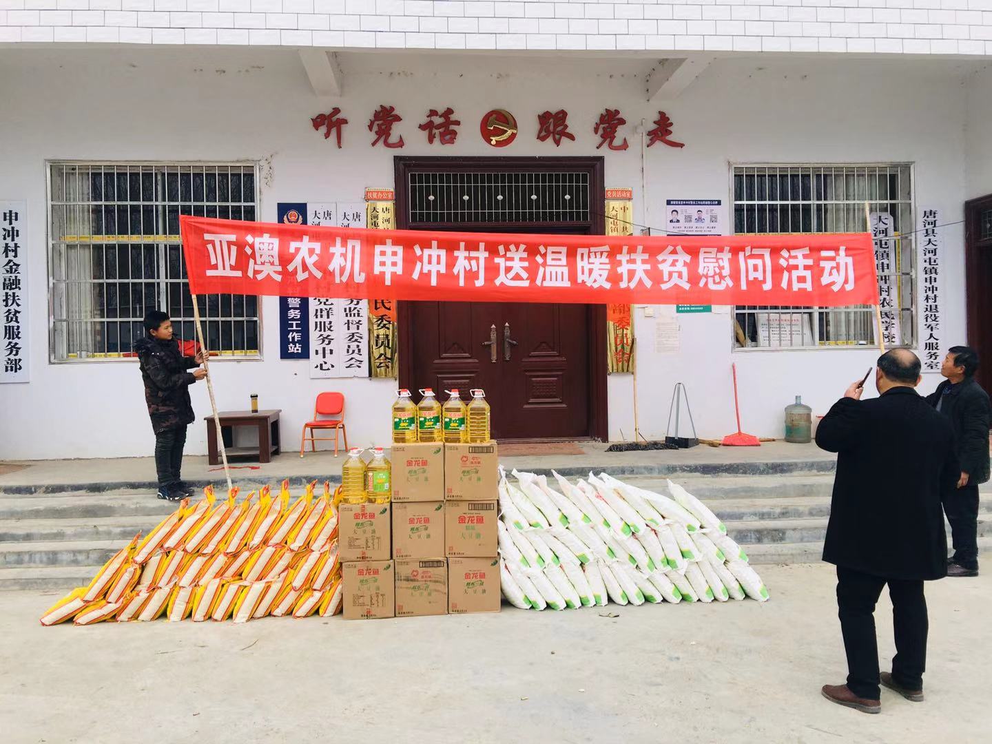 為積極貫徹落實(shí)唐河縣委縣政府”百企幫百村”的扶貧工作精神,履行企業(yè)社會(huì)責(zé)任,按照縣扶貧辦工作統(tǒng)一部署,亞澳農(nóng)機(jī)結(jié)合對(duì)口幫扶的申沖村實(shí)際情況,因地制宜,統(tǒng)籌規(guī)劃,務(wù)求實(shí)效,在2018-2019年開展了一系列的扶貧幫困工作。