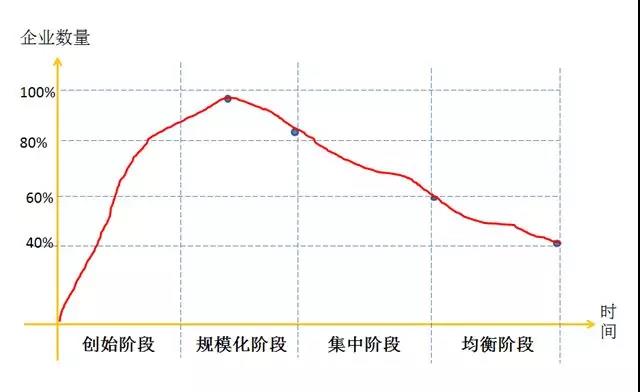 在一個(gè)行業(yè),從長(zhǎng)期看,企業(yè)要存活下來就要有超出平均水平的成本控制能力。管理學(xué)家陳春花認(rèn)為一個(gè)行業(yè)內(nèi)企業(yè)數(shù)量和時(shí)間軸之間的關(guān)系可以通過四個(gè)發(fā)展階段來說明:初創(chuàng)階段、規(guī)?;A段企業(yè)數(shù)量一直上升,規(guī)?;笃谄髽I(yè)數(shù)量達(dá)到頂峰,開始有擠出效應(yīng),約20%企業(yè)出局,到集中階段又有20%企業(yè)出局,到均衡階段還要淘汰20%,最后的競(jìng)爭(zhēng)就在剩下的40%企業(yè)之間展開。