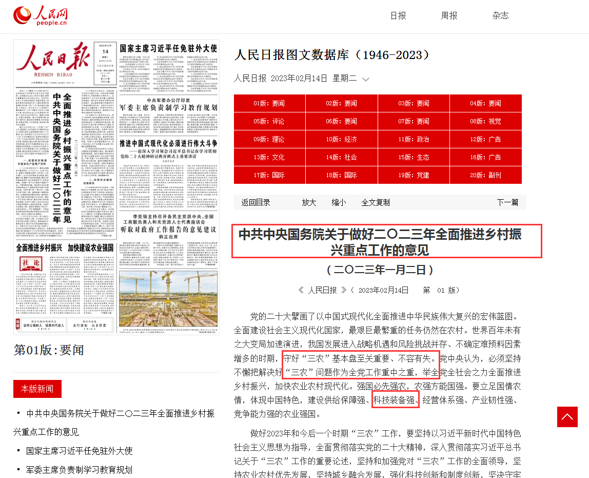 2023年中央一號文件2月13日正式發(fā)布。文件提出,要立足國情農(nóng)情,體現(xiàn)中國特色,建設(shè)供給保障強、科技裝備強、經(jīng)營體系強、產(chǎn)業(yè)韌性強、競爭能力強的農(nóng)業(yè)強國。