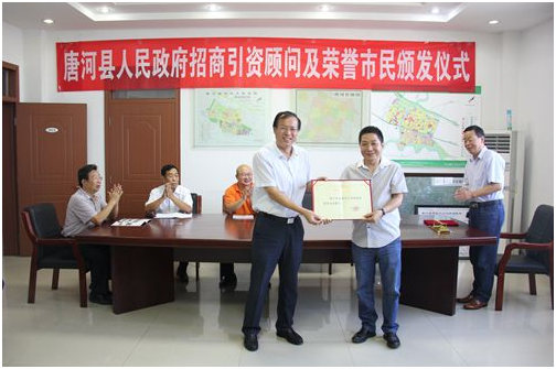 9月1日,唐河縣人民政府舉行招商引資顧問及榮譽(yù)市民頒發(fā)儀式??h長周天龍、政府副縣長王天清、縣產(chǎn)業(yè)集聚區(qū)黨工委書記王全廣等出席儀式。